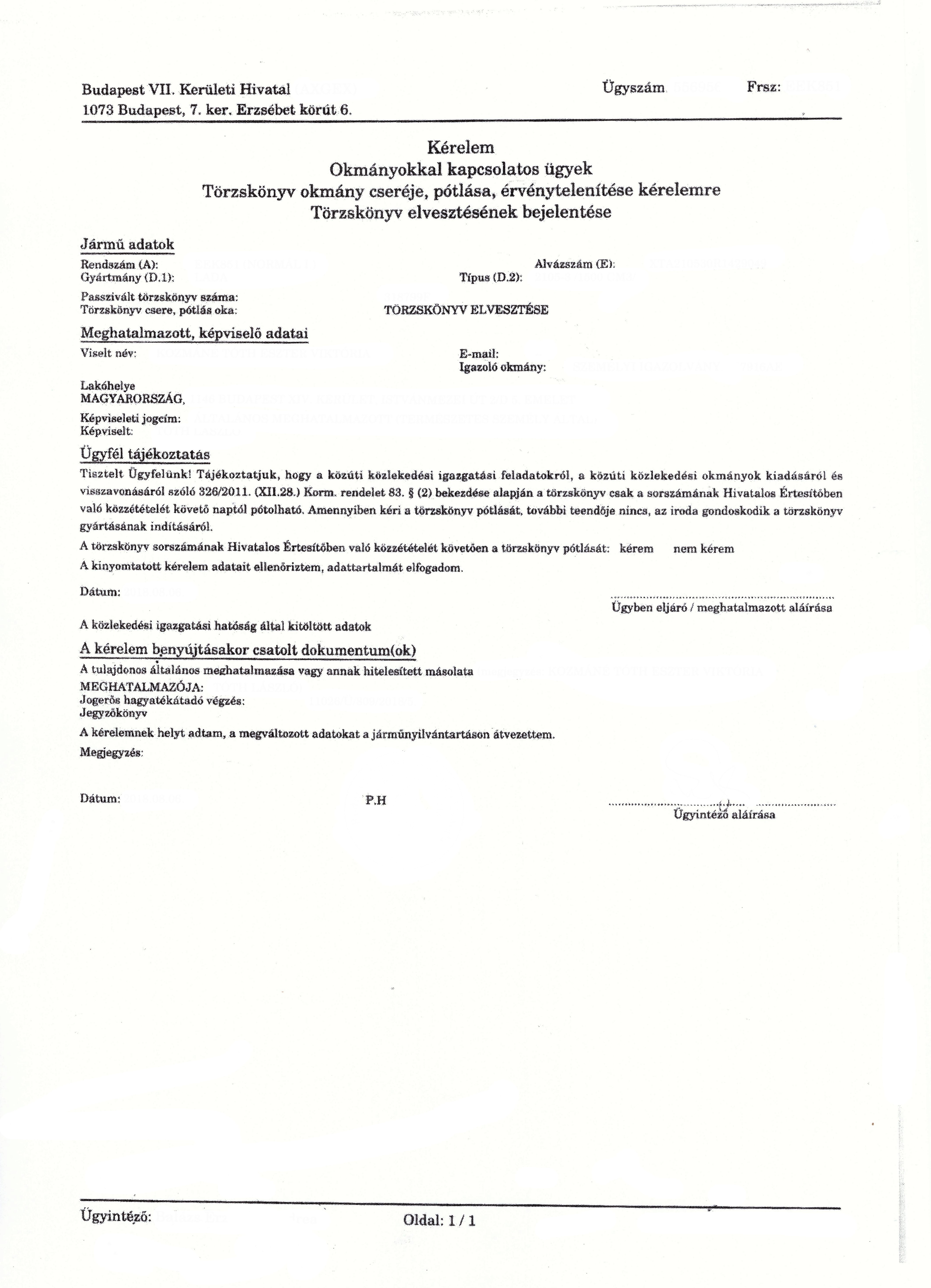 Amennyiben ez hiányzik, az önkormányzattól kell a törzskönyv elvesztéséről igazoló dokumentumot igényelni és bemutatni a forgalomból való kivonás során. Példa